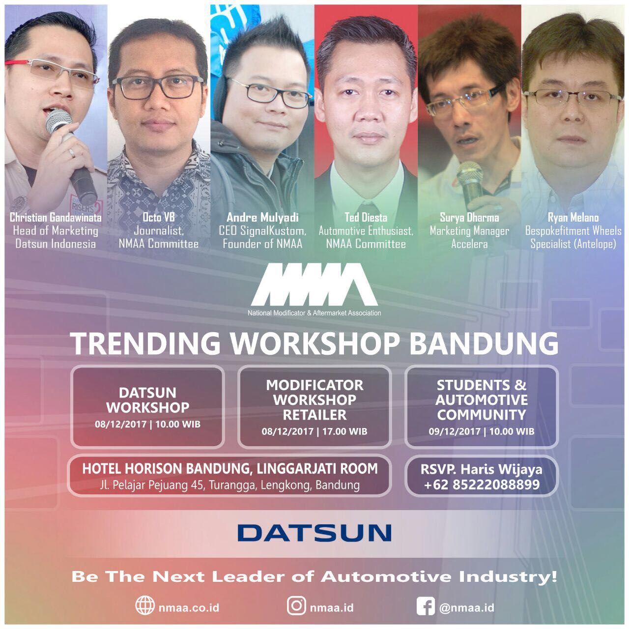 Trending Workshop 2017 Penutup di Kota Kembang. Menutup tahun sekaligus rangkaian program tahunan, National Modificator & Aftermarket Association (NMAA) akan mengadakan Trending Workshop 2017 di Linggarjati Room, hotel Horison, Jl. Pelajar Pejuang 45, Turangga, Lengkong, Bandung. Trending Workshop adalah flagship event NMAA untuk mengakomodir tren knowledge sharing di kalangan para pecinta modifikasi dan modifikator.