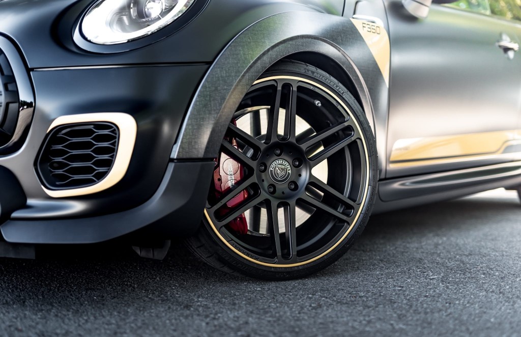 Secara keseluruhan bagian eksterior sengaja dipertahankan, apalagi fender flare dibuat terpisah dengan sepatbor. Selain itu untuk menghasilkan efek downforce, Manhart GP F350 disematkan spoiler di bagian atas. Dari segi tampilan bodi, Manhart GP F350 tentunya dibuat lewat ide orisinil. Mini Cooper berkelir hitam tersebut ditambah dengan aksen berwarna emas.