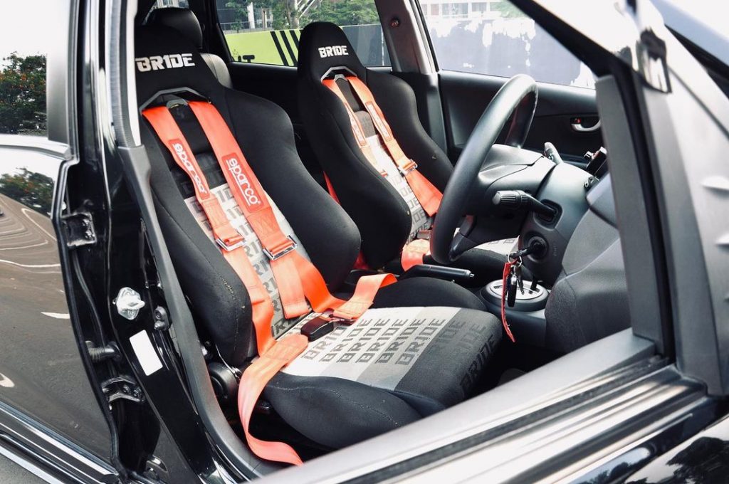 Kesan racing terkonsep di tampilan ruang interiornya. Seperti dua buah bangku semi bucket seat Bride Erigo dan Harness Recaro.