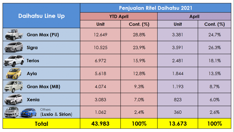 Pada April penjualan Daihatsu didominasi 3 model utama, yaitu Sigra sebanyak 3.591 unit, berkontribusi 26,3%; disusul Gran Max Pick Up dengan hasil 3.381 unit (24,7%); dan Terios yang mencapai 2.481 unit (18,1%).