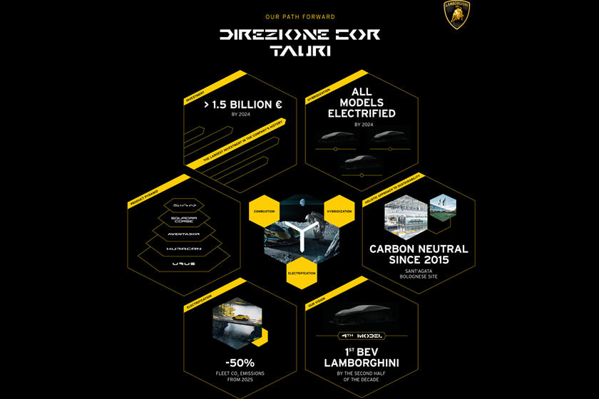 Dilihat dari skema yang dipaparkan Winkelmann langkah ini akan bermula pada 2023 ketika model hybrid produksi massal pertama diluncurkan. Pada akhir 2024, Lamborghini berjanji seluruh lini produknya mulai ditenagai mesin listrik, termasuk penerus Lamborghini Huracan dan Aventador.