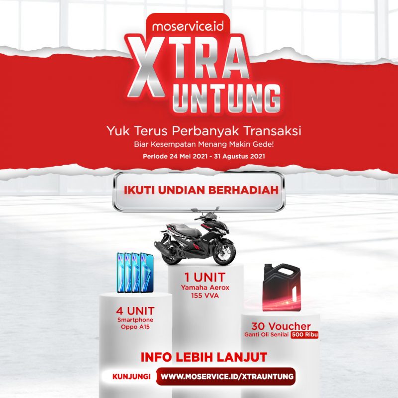 Sebagai bentuk apresiasi ke konsumen setianya, Moservice.id menggelar Program Undian Xtra Untung mulai 24 Mei 2021 sampai 31 Agustus 2021. Dengan hadiah menarik 30 voucher oli senilai masing-masing Rp 500.000, 4 unit smartphone Oppo A15, dan hadiah utama 1 (satu) Unit Yamaha All New Aerox 155 on the road. Untuk dapat mengikuti undian ini, konsumen dapat melakukan transaksi servis melalui Moservice.id sebanyak 3 (tiga) kali booking selama periode program.