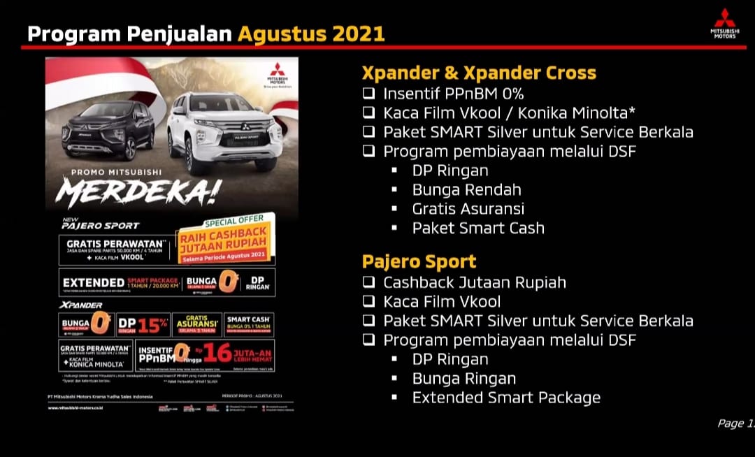 Adapun khusus pembelian New Pajero Sport di Agustus 2021, konsumen bakal mendapatkan pilihan program pembiayaan melalui PT Dipo Star Finance dengan DP ringan mulai 15 persen, bunga ringan 0 persen dengan tenor hingga 1 tahun, Extended SMART Package 1 tahun, gratis kaca film V-Kool, program casback hingga Rp7.500.000.
