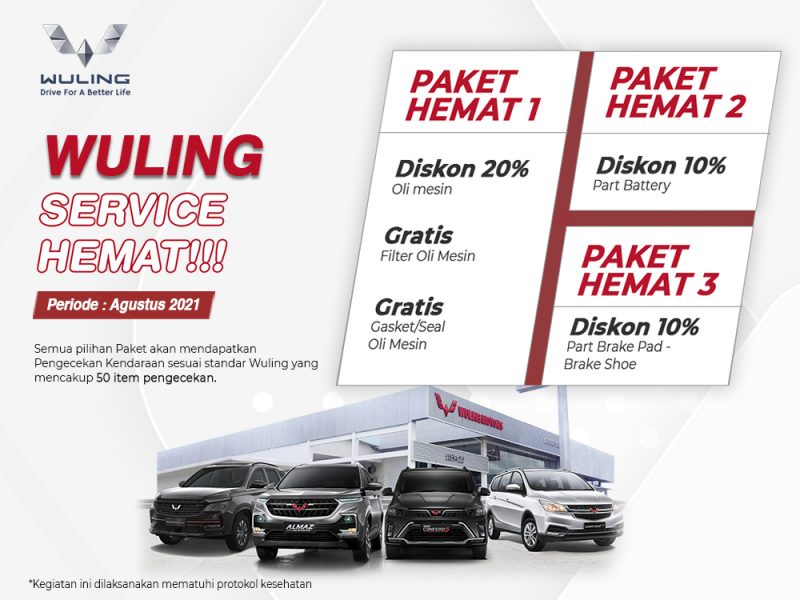 “Kami terus berupaya hadirkan beragam inovasi layanan bagi konsumen yang kini kami wujudkan melalui Wuling Service Hemat. Melalui program ini, pelanggan setia Wuling bisa mendapat program menarik servis atau perawatan kendaraan di jaringan dealer resmi Wuling selama bulan ini. Kami berharap, Wuling Service Hemat dapat digunakan pelanggan di masa pandemi ini,” ujar Taufik S. Arief, Aftersales Director Wuling Motors.