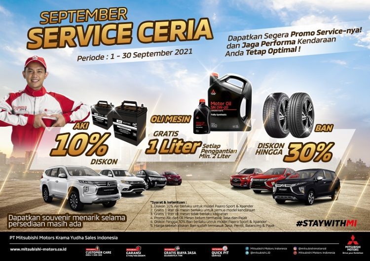 NMAA News – Dalam upayanya terus memberikan benefit atas kepemilikan kendaraan Mitsubishi, PT Mitsubishi Motors Krama Yudha Sales Indonesia (MMKSI) kembali menggelar program promo layanan purna jualnya di September 2021. Untuk bulan ini, MMKSI menggelar kampanye “September Service Ceria”. Kampanye ini merupakan salah satu wujud upaya MMKSI membuat konsumennya mendapat layanan lebih mudah dan nyaman dalam memelihara dan merawat kendaraan Mitsubishi-nya.