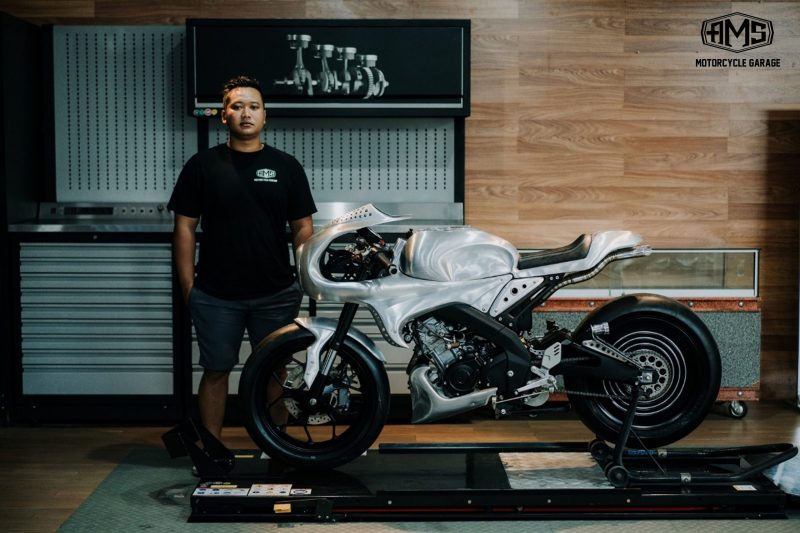 Sementara itu, kubu AMS Motorcycle Garage menerapkan identitasnya dan menekankan pada garapan seni XSR 155 dengan genre Café Racer berjuluk ‘Sang Macan’. ”Pada XSR 155 ini diberikan sentuhan dan lekukan body work sesuai pakem kami; tidak memakai pelapis cat untuk finishing.”