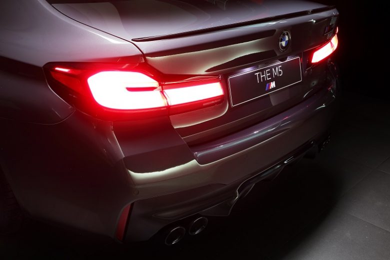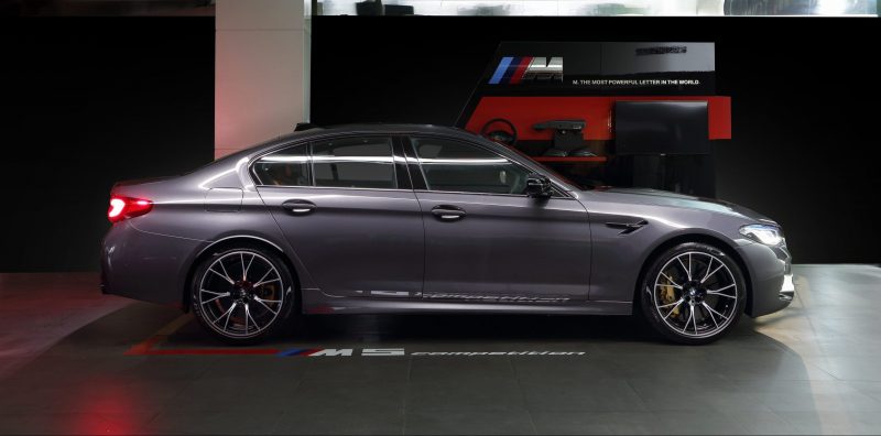 Badge BMW M5 Competition berwarna Hitam menghiasi BMW M-specific kidney grille, BMW M gills dan bagasi, sedangkan M5 Competition door sills dapat menyala dengan sangat terang. Kelengkapan ini ditutup dengan BMW M Sport exhaust system dalam warna Black Chrome.