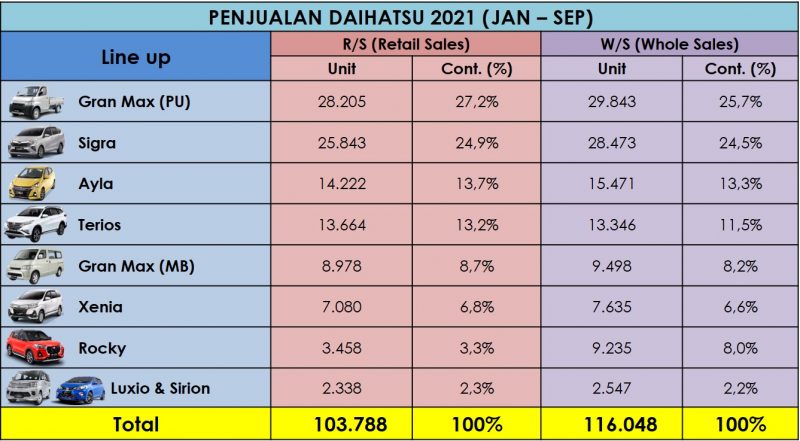 Secara bulanan, penjualan Daihatsu juga mengalami kenaikan dibandingkan bulan sebelumnya. Pada September 2021, retail sales Daihatsu mencapai 14.187 unit, naik sebesar 16,3% dibandingkan Agustus 2021 lalu, dengan top 3 penjualan tertinggi yaitu Sigra 3.984 unit atau berkontribusi 28,1%, disusul Gran Max PU 3.889 unit (27,4%), dan Ayla 2.064 unit (14,5%).