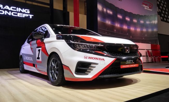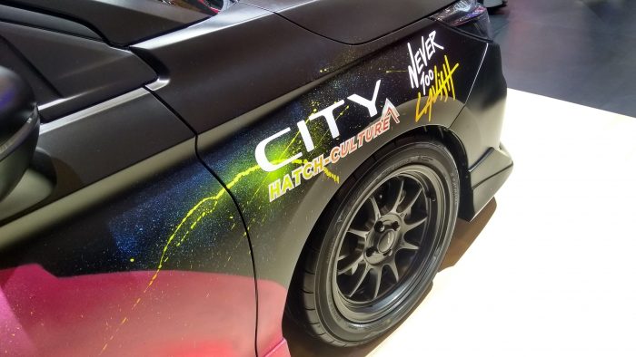 Secara tampilan, City Hatchback bergaya racing di booth Honda tersebut punya tampilan livery dari perpaduan warna merah, silver, dan hitam. Komposisi velg dan ban juga ikut dirubah. Versi standarnya velg Weds Sport TC10SN dibalut ban 195/50 R15 berpenampilan meaty fitment. Sejumlah aksen krom bagian depan seperti grill, bingkai foglamp hingga lampu diberi warna hitam. Senada dengan konsep mobil balap, kedua spion, bumper belakang, spoiler juga diberi warna hitam.