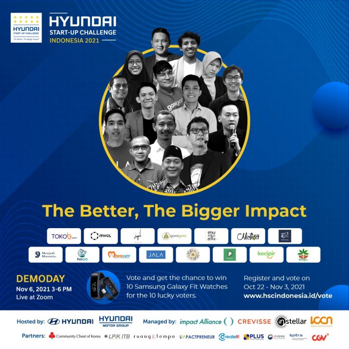 Mengusung slogan “The Better, The Bigger Impact”, Hyundai Motor Group berkolaborasi dengan Impact Alliance, Crevisse, Instellar, Indonesia Creative City Network, dan Kementerian Pariwisata dan Ekonomi Kreatif (Kemenparekraf), serta peserta Baparekraf untuk Startup (BEKUP) untuk Hyundai Start-up Challenge Indonesia 2021.