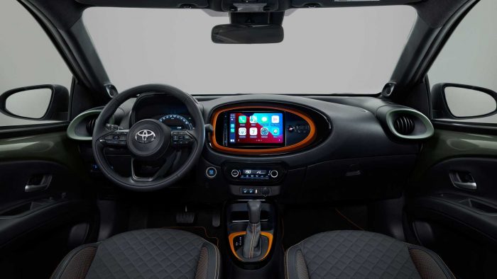 Beralih ke bagian interior, Aygo X didominasi oleh warna hitam yang dipadukan dengan sentuhan warna sesuai dengan kelir eksterior mobil. Selain itu, juga dibekali sejumlah fitur pada sektor hiburan. Seperti layar sentuh berukuran 9 inci yang terintegrasi dengan Toyota Smart Connect. Bahkan, sudah mengusung konektivitas Apple CarPlay dan Android Auto, pembaruan software lewat Over the Air (OTA), dan navigasi berbasis cloud.