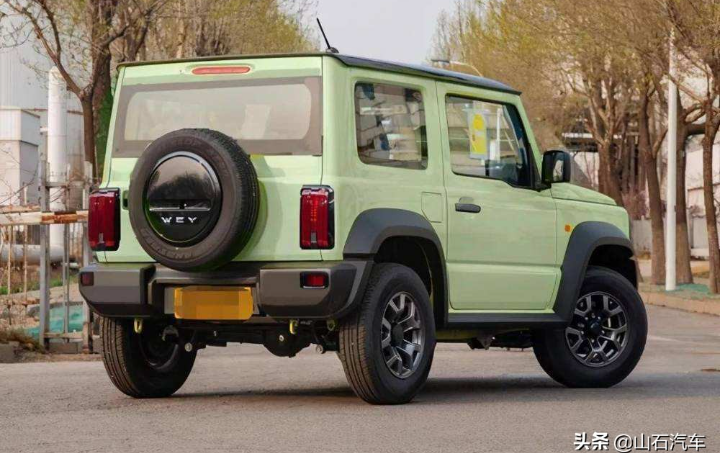 Sedikit perbedaan di bagian belakang ada di layout lampu remnya, di mana Jimny meletakkan lampu rem agak ke bawah, menempel di bumper dengan posisi horisontal. Sedangkan Great Wall Tank 100, lampu remnya dinaikkan ke atas menempel dengan pintu belakang dan posisinya vertikal.