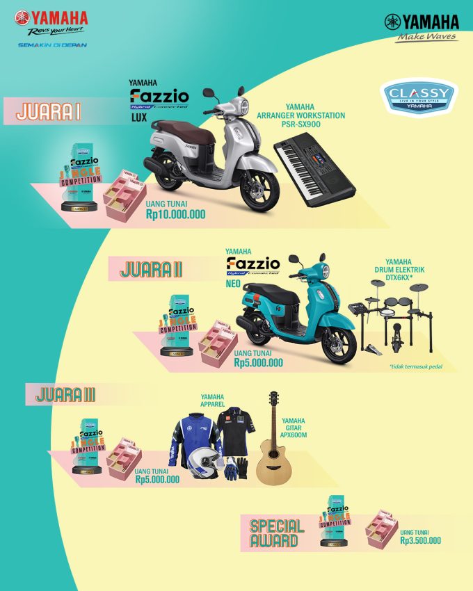 • Juara 2 : 1 Unit Yamaha Fazzio Hybrid-Connected NEO Version + 1 Unit Yamaha Drum Elektrik DTX6KX + Uang Tunai Senilai Rp 5,000,000,- + Trophy
