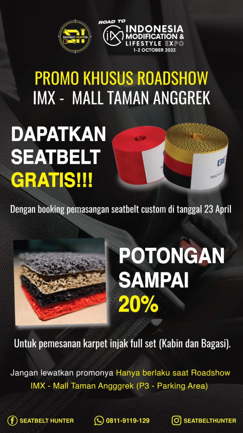 Sekarang saatnya memilih warna sabuk pengaman untuk dipersonalisasi dengan warna interior mobil. Produk aftermarket Seatbelt Hunter bersiap suguhkan produk seatbelt gratis di gelaran Road to IMX 2022: Jakarta Automotive Modified Meetup, Sabtu 23 April mendatang.
