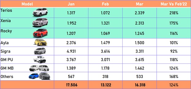 Bila membandingkan secara bulanan (Maret 2022 VS Februari 2022), penjualan Daihatsu mengalami kenaikan sekitar 24%. Adapun top 3 kontributor model Daihatsu yang mendapat diskon PPnBM, dan memiliki persentase penjualan tertinggi terdapat model Terios dengan kenaikan signifikan 118%, atau lebih dari 2 kali lipat menjadi 2.339 unit dari sebelumnya 1.072 unit. Disusul Xenia naik 75% menjadi 2.313 unit; dan Rocky 16% menjadi 1.245 unit.
