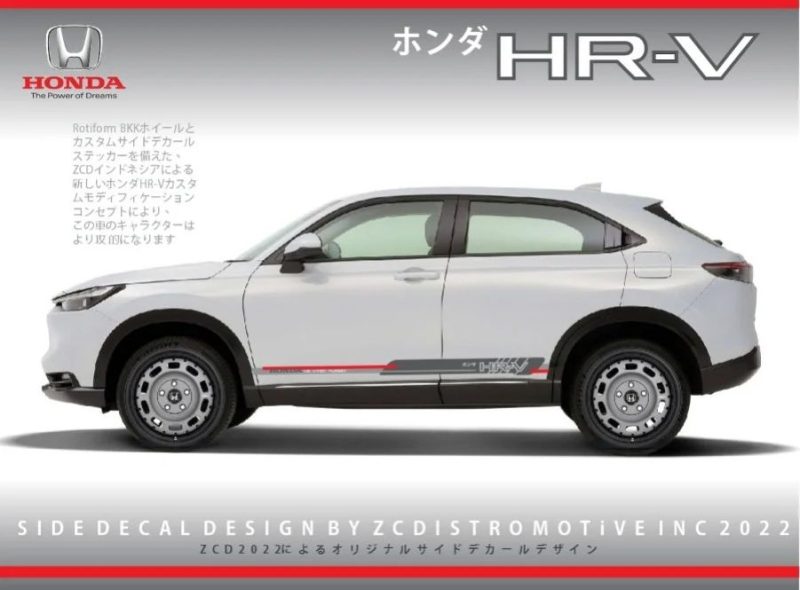 Sekeliling bodi juga mendapat stiker decal bernuansa JDM Style dari paduan warna abu merah dan putih berhias tulisan Honda HR-V dalam aksara Jepang.