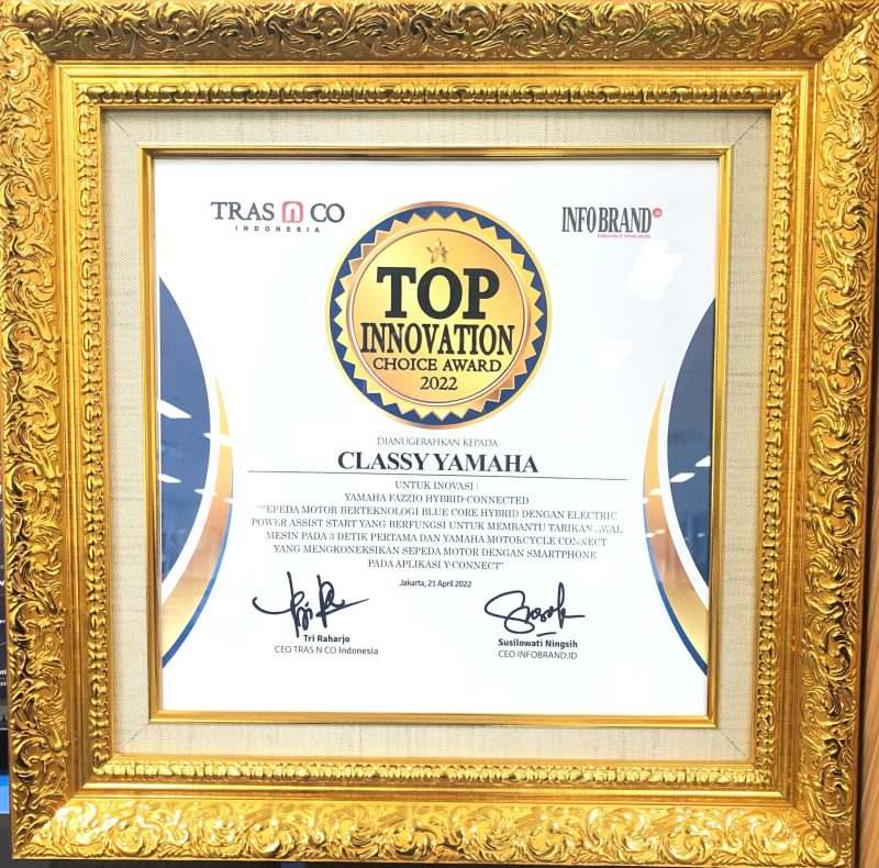 Penghargaan Top Innovation Choice Award 2022 dari Brand Choice Award 2022 yang diselenggarakan secara virtual oleh Redaksi INFOBRAND.ID dan TRAS N CO Indonesia tanggal 21 April 2022 ini, semakin membuktikan keunggulan Yamaha Fazzio Hybrid – Connected sebagai sepeda motor yang unggul di kelasnya dengan inovasi tepat dalam menjawab kebutuhan generasi masa kini di era digital.