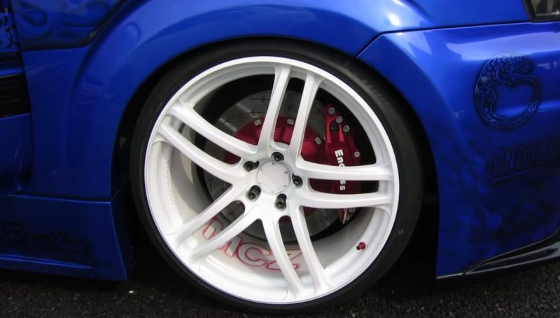 Tampilan menarik juga hadir di empat ruang fender dengan hadirnya velg model twin multi-spoke warna putih berbalut ban profil tipis. Dibalik velg tersebut sudah bercokol peranti Big Brake Kit (BBK) 6 piston merek Endless.
