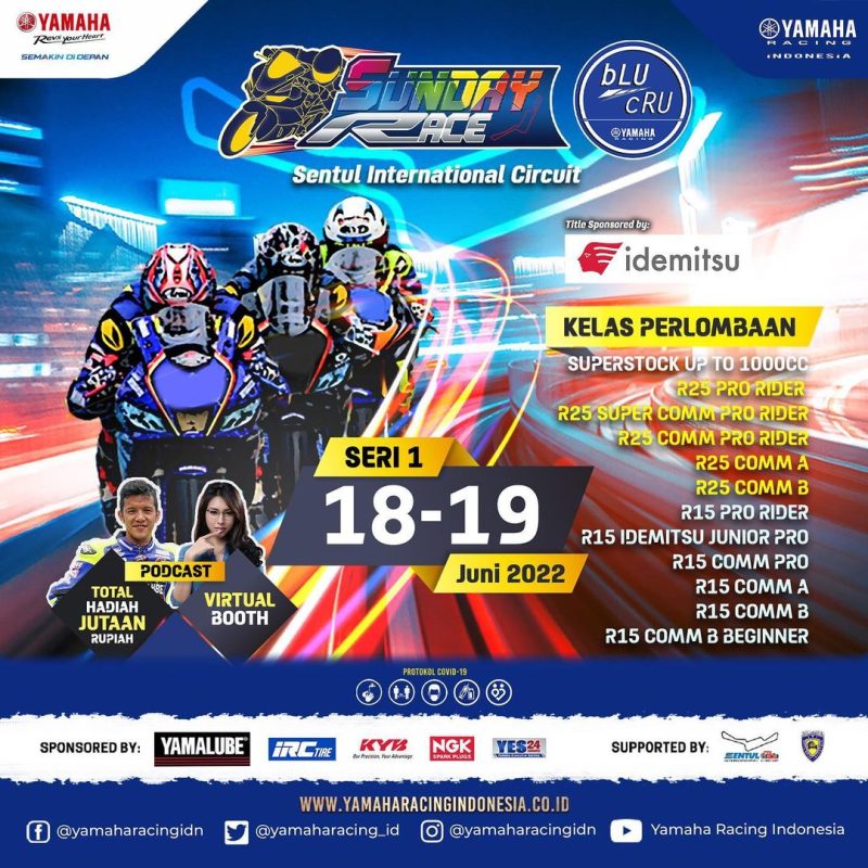 Menariknya, Idemitsu bLU cRU Yamaha Sunday Race 2022 Sentul menjadi kompetisi balap motor sport yang digelar pertama tahun ini dengan tetap memperhatikan protokol Covid-19 sesuai dengan peraturan pemerintah. Event ini juga dapat terselenggara berkat dukungan dari Yamalube, IRC, KYB, NGK dan YES24 sebagai sponsor.