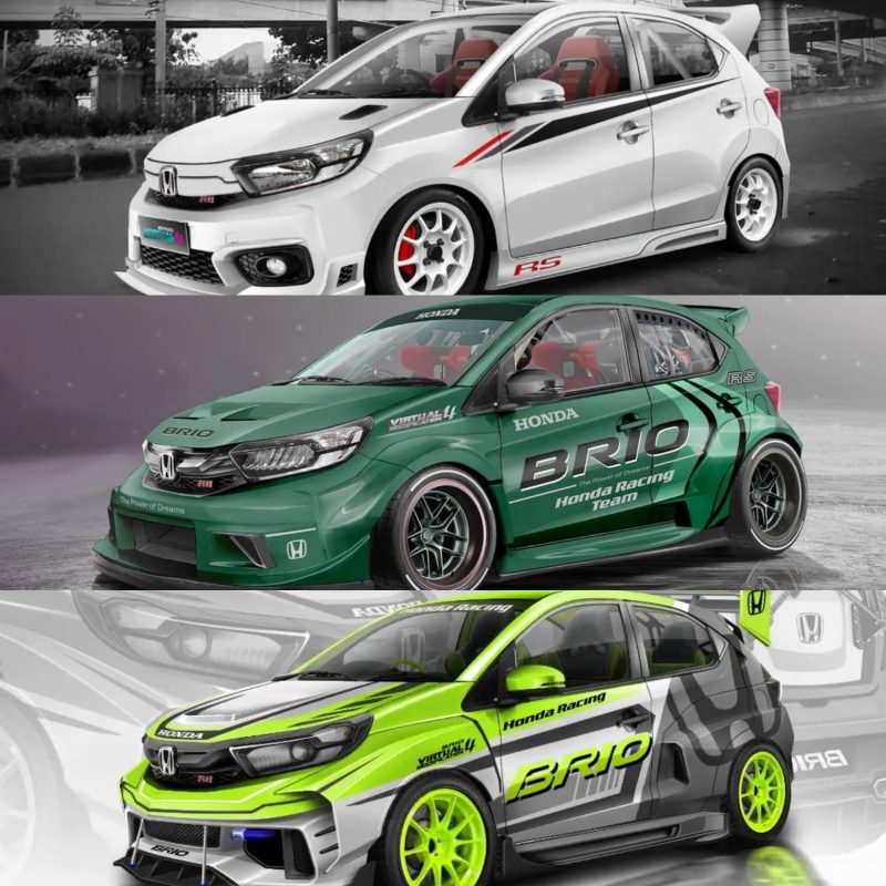 Dilanjut desain Honda Brio bergaya racing dari akun Instagram @by.modificator. Mengekspos tampilan wide body, velg lebar dan ban slick membuat wujud Honda Brio makin sangar. Ada juga beberapa aksesori body kit seperti bumper, kap mesin, side skirts, diffuser dan wing spoiler.