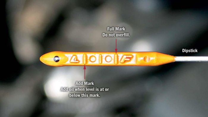 Tanda yang umum terdapat pada ujung dipstick berupa huruf ‘F’ (full/penuh) dan ‘E’ (empty/kosong). Di antara kedua huruf itu terdapat garis-garis yang menandakan volume oli.
