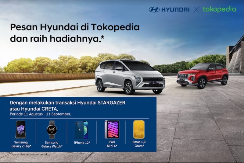 NMAA News – Bertepatan perhelatan GAIKINDO Indonesia International Auto Show (GIIAS) 2022, PT Hyundai Motors Indonesia (HMID) bekerjasama Tokopedia menghadirkan program hadiah langsung setiap transaksi pembelian Hyundai CRETA dan Hyundai STARGAZER melalui dealer resmi Hyundai di Tokopedia dengan S&K berlaku.