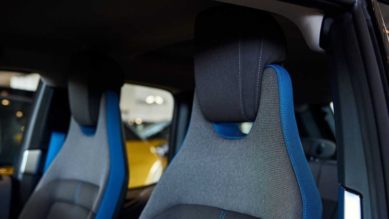 Mengintip bagian dalamnya, jok menggunakan bahan fabrik warna abu-abu muda dikombinasi abu-abu tua, berikut aksen biru muda di jok dan seatbelt untuk mengentalkan nuansa elektrifikasi.