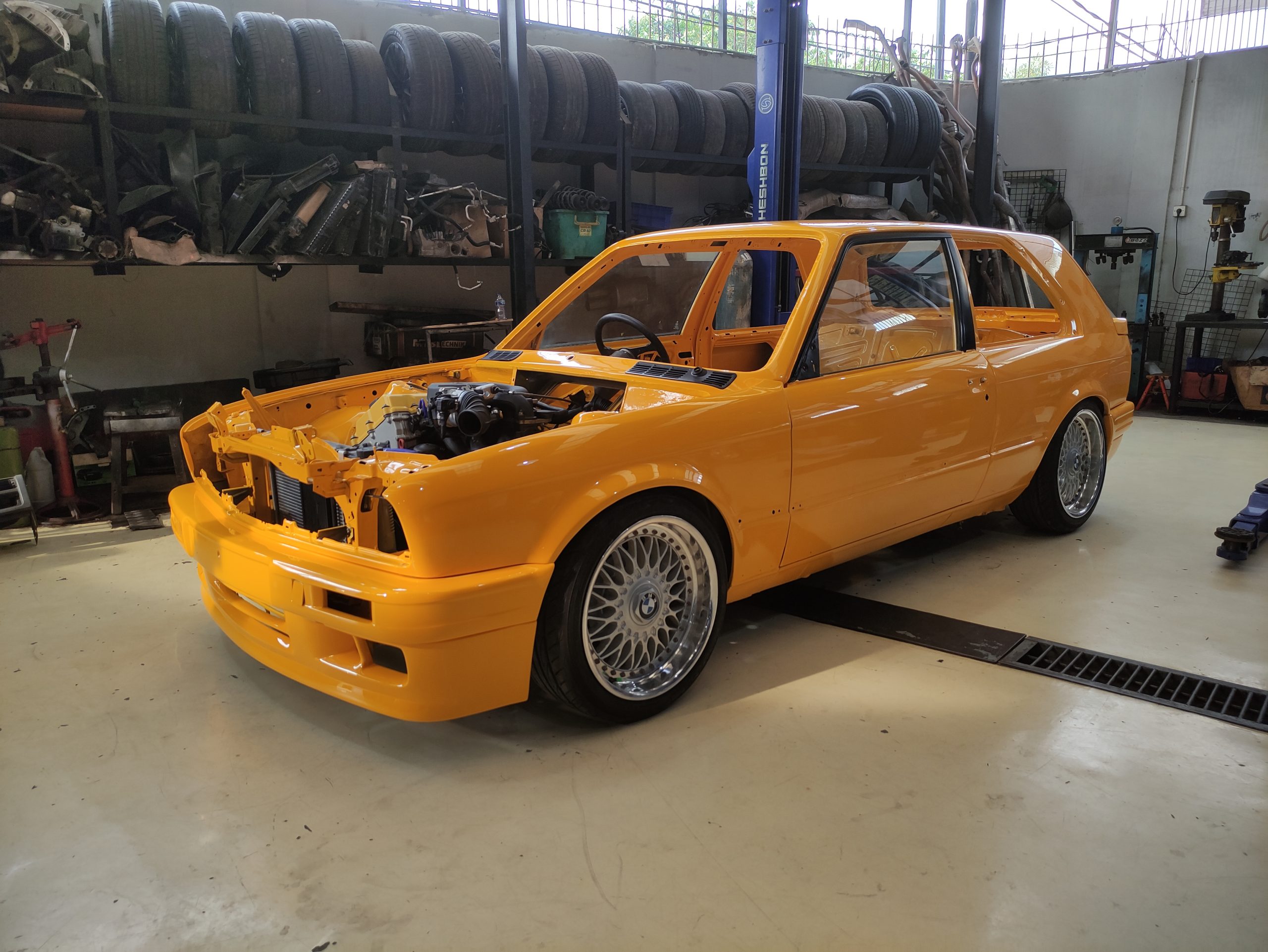 Terlihat juga sektor kaki-kaki sudah diberi velg jenis mesh bergaya klasik dari BMW dan warna kelir kuning di sekujur bodi.