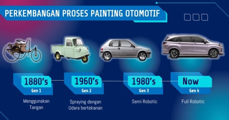 Dalam perkembangannya, proses pengecatan di industri otomotif diawali menggunakan metode “kuas/brushing”, lalu spraying dengan memanfaatkan udara bertekanan tinggi, kemudian mulai menerapkan teknologi “semi robot”, hingga saat ini proses pengecatan melibatkan “full robotic“ pada keseluruhan bodi mobil.