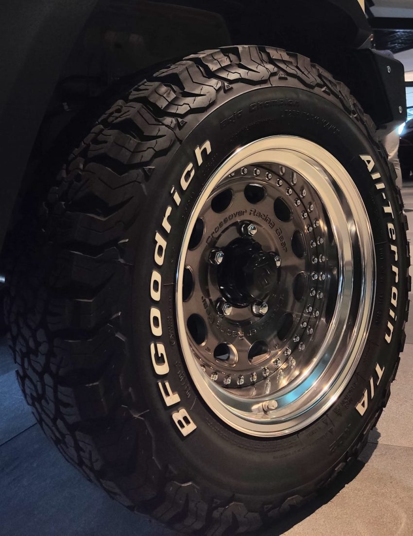 Konsep modifikasi Off-road ditegaskan dari ubahan kaki-kaki. Satu set velg Work Galvatre ukuran 16 inci dipilih untuk mengisi penuh ruang fender. Velg palang dengan finishing hi-polish ini kemudian dibalut ban BFGoodrich ATKO2 235/70 R16.