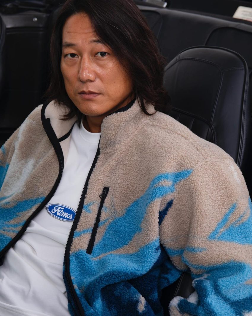Di unggahan foto Sung Kang tampil casual menggunakan jaket fleece cloud-graphic, kaos, celana kargo, dan kemeja flanel dalam berbagai angle pengambilan foto.