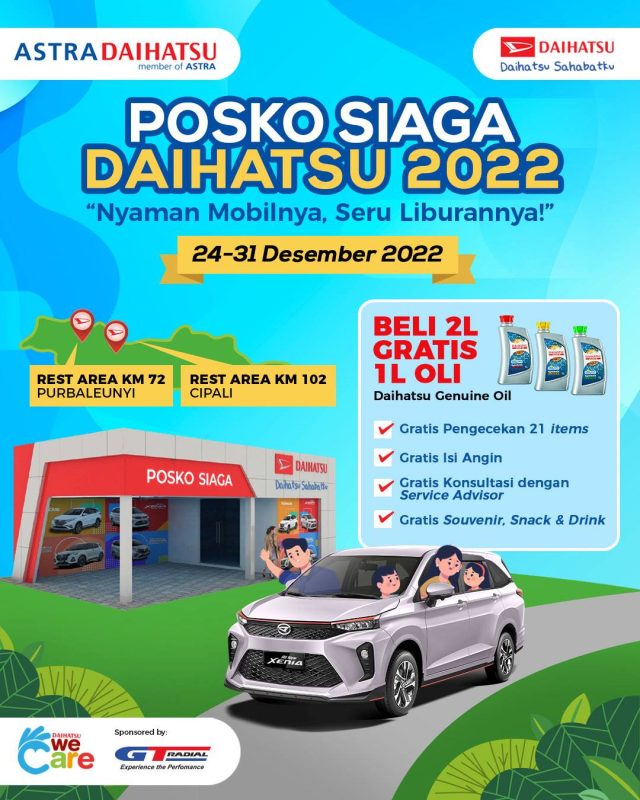 Melalui momen ini, Daihatsu tetap hadir menemani pelanggan lewat layanan Posko Siaga Daihatsu yang dapat menambah kenyamanan dan keamanan pelanggan ketika dalam perjalanan. Layanan ini siap menyambut pelanggan selama 24 jam pada 24-31 Desember 2022, dan berlokasi di 2 titik berbeda, yaitu Rest Area KM 72A Tol Purbaleunyi dan Rest Area KM 102A Tol Cipali, dimana kedua lokasi tersebut merupakan titik strategis dan menjadi salah satu jalur yang banyak dilalui oleh pemudik dan wisatawan.