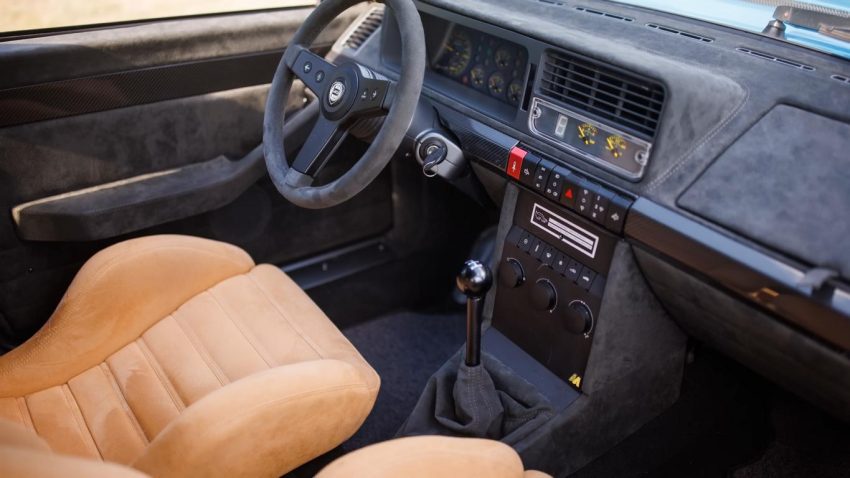 Sementara itu, ruang kabin sudah mendapat dua buah jok warna cokelat terlihat dan tampilan dasbor berbalut Alcantara, sisanya masih mengandalkan part bawaan Lancia Delta yang direstorasi.