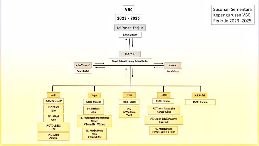 Pada akhirnya, floor raker memutuskan menerima dan menunjukk Adi Yunadi Endjun sebagai Ketua Umum VBC masa periode Januari 2023 hingga Desember 2025. Seusai pelantikan, Adi langsung mengajak Kepala Bidang di VBC untuk menyusun draft rencana kerja, draft pengajuan proposal, dan target kerja 2023.