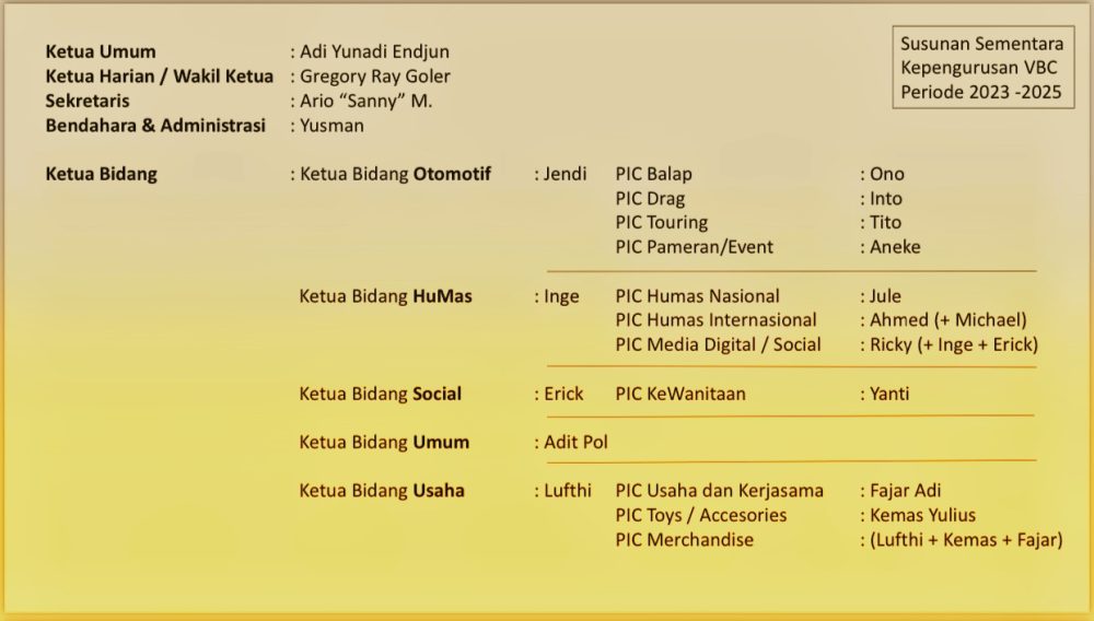 Selain itu, Ray Gregory Goeller terpilih kembali menjadi Ketua Harian. Sekaligus memanfaatkan momentum, VBC secara floor juga menyetujui pengangkatan Dewan Pengawas (Dewas) organisasi yang diisi oleh Aria WD Loekito, Vega Riyanto, dan Muhanto Hatta.