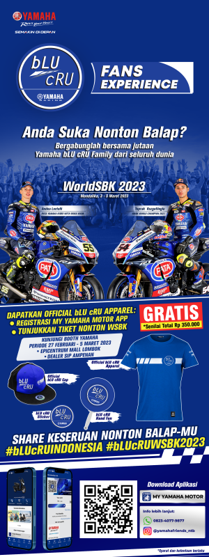 Kemeriahan Yamaha bLU cRU Fans Experience tahun ini diawali dengan menyemarakkan ajang World Superbike (WSBK) yang akan digelar di Mandalika, Nusa Tenggara Barat. Selama sepekan mulai 27 Februari hingga 5 Maret 2023, para pemilik Yamaha yang ingin bergabung Yamaha bLU cRU Family dapat kunjungi hospitality booth Yamaha bLU cRU di dealer Yamaha SIP Ampenan Mataram dan Lombok Epicentrum Mall Mataram untuk mendapatkan Bonus Extra Point di My Yamaha Motor Member, serta Official Apparel Yamaha bLU cRU secara GRATIS.
