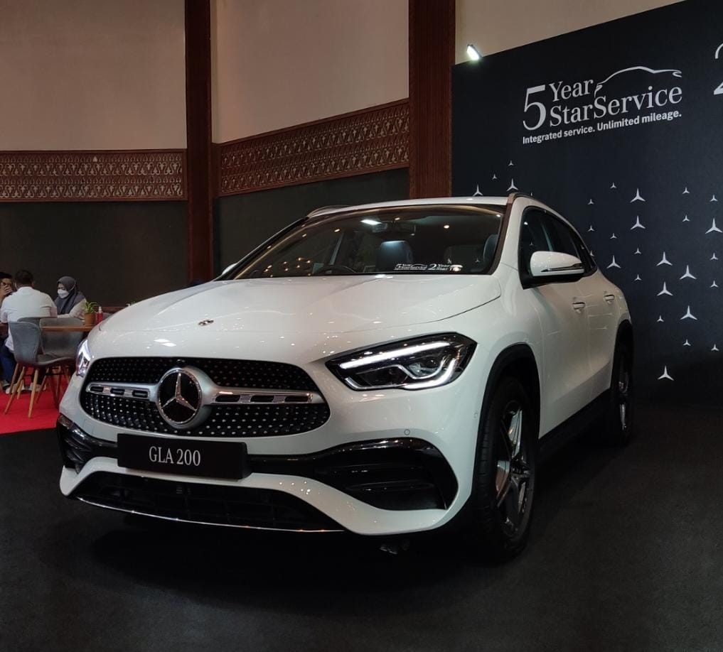Aura berani Mercedes-GLA meski tampil lebih kalem, terlihat dari desain gril vertikal berhias imbuhan aksen sporty.
