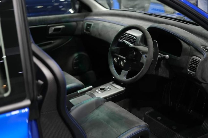 Bagian interior terlihat tidak jauh berbeda dengan kondisi standar, dengan imbuhan material pelapis Alcantara.