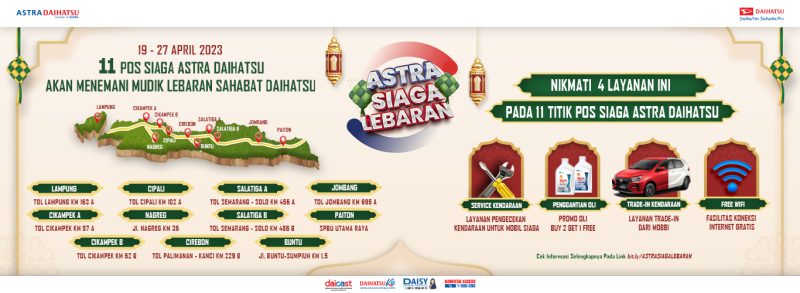 Daihatsu juga hadirkan 11 Pos Siaga pada 19-27 April 2023. Selama perjalanan mudik, Sahabat dapat memanfaatkan layanan Pos Siaga Astra Daihatsu seperti, servis kendaraan, penggantian oli dengan promo buy 2 get 1 free, layanan trade-in kendaraan, akses koneksi internet gratis (free wi-fi), serta layanan lainnya.