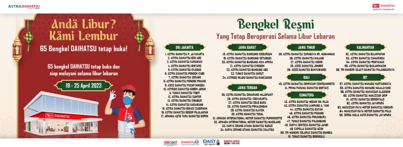 NMAA News – Menyambut Libur Lebaran Hari Raya Idul Fitri 1.444 H, Daihatsu siap siaga temani aktivitas mudik pelanggan agar tetap tenang menuju kampung halaman. Daihatsu siapkan 65 Bengkel Siaga di seluruh Indonesia yang siaga selama periode libur Lebaran 19-25 April 2023 dengan jam operasional 08:00-16:00, termasuk Sabtu dan Minggu.