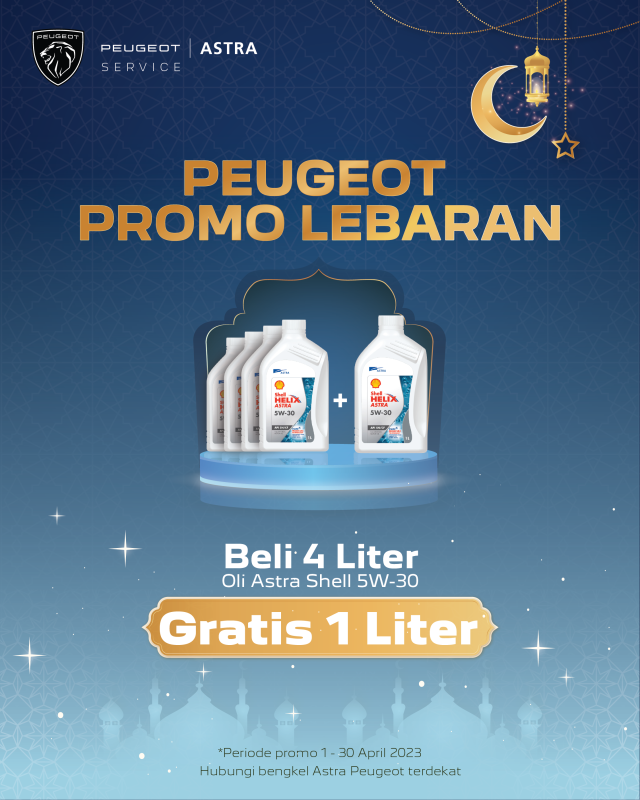 Astra peugeot memberikan penawaran program “Peugeot Promo Lebaran” yang berlangsung 1 hingga 30 April 2023 dengan melakukan pembelian Oli Astra Shell 5W-30 sebanyak 4 liter mendapatkan gratis 1 liter free.