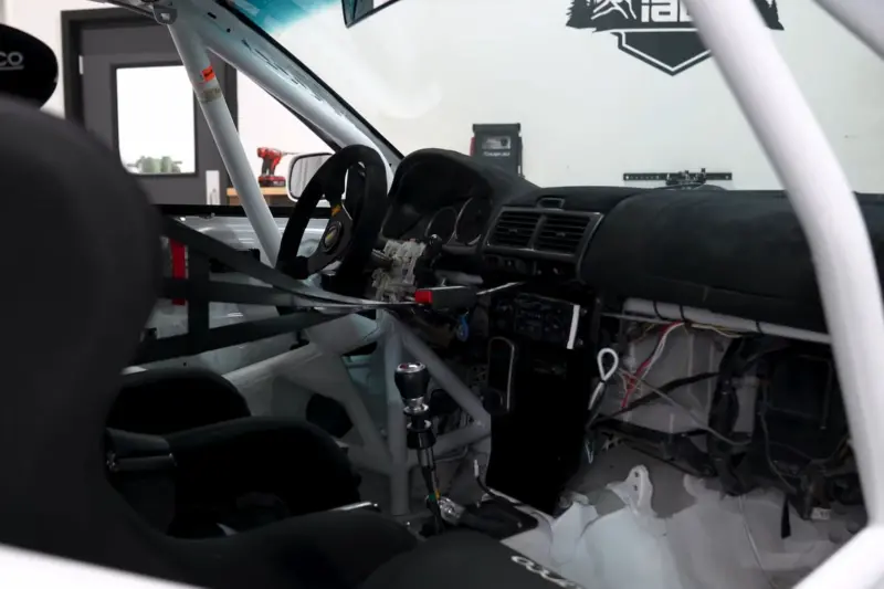 Pengemudi dimanjakan dengan jok bucket Sparco, setir kemudi OMP, controler DCCD, dan dasbor baru. Semua bagian interior juga sudah dikrangkeng oleh custom rollcage agar lebih rigid dan safety.