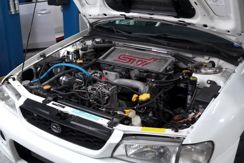 Di balik kap mesin, Impreza coupe sudah menerima donor jantung mekanis berkode EJ205 dari WRX dengan model intercooler top-mount STI. Lonjakan tenaga dari mesin didukung pemasangan turbocharger Blouch 16G.