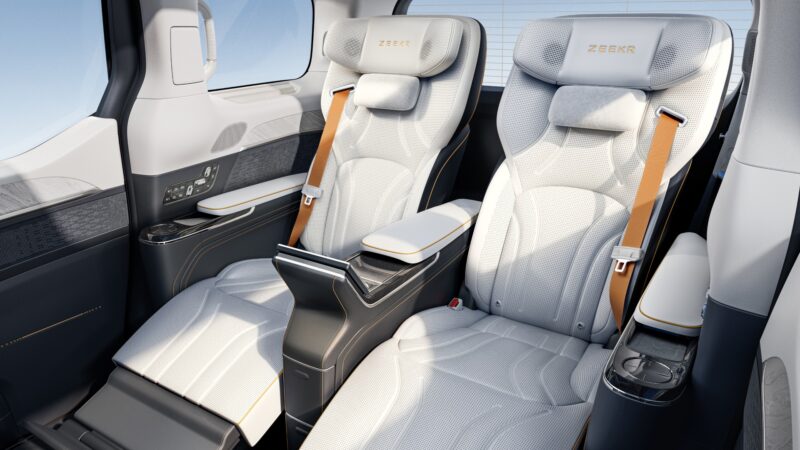 Dimensi bodi juga berpengaruh pada suguhan premium di ruang kabin. Zeekr 009 Glory Edition terapkan tata letak kursi 2+2 dengan kelengkapan foot rest tiap kursi.