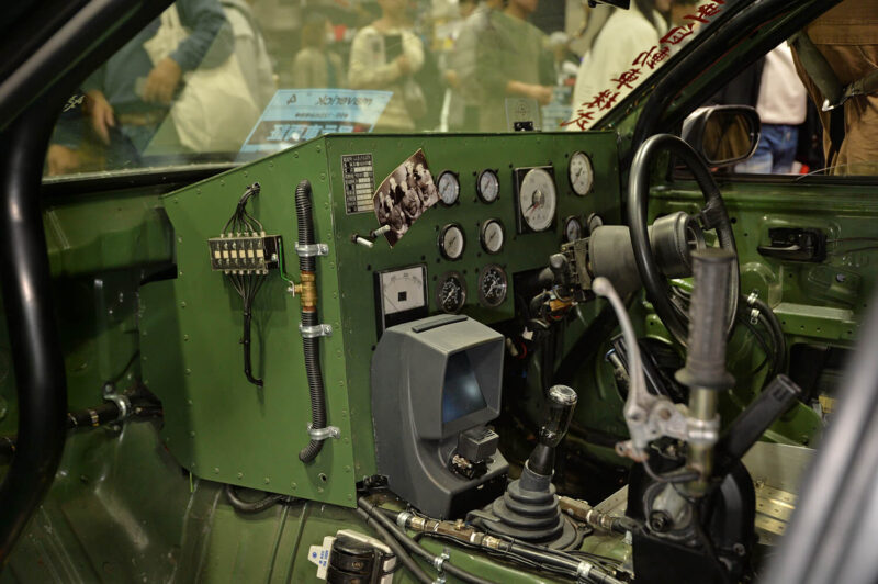 Masuk ke ruang kabin, tidak lagi berasa seperti kabin mobil pada umumnya. Miyaji-san membongkar dasbor untuk membangun ulang dengan suasana kabin pesawat tempur Zero Fighter.