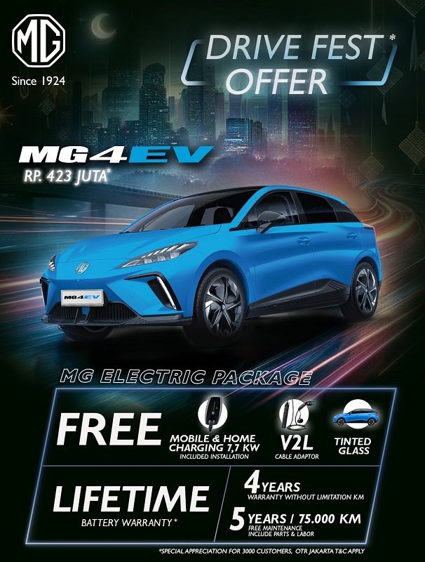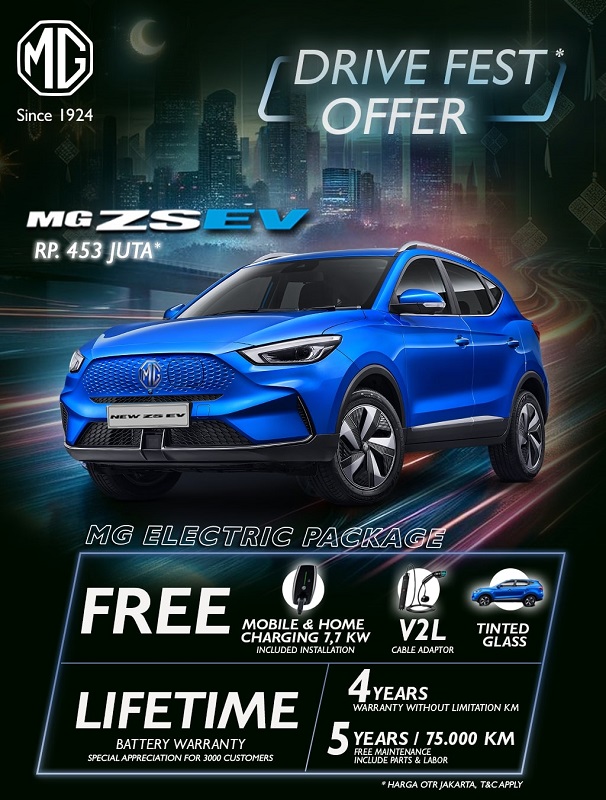 Promo tidak hanya berlaku pembelian lini kendaraan listrik namun juga lini kendaraan MG lainnya, seperti MG VS HEV, MG HS, MG ZS, dan MG 5 GT. MG hadirkan penawaran menarik; antara lain garansi 5 tahun tanpa batasan jarak tempuh, cicilan berbunga rendah, gratis perawatan 4 tahun atau 50.000 km termasuk suku cadang, dan tinted glass gratis.