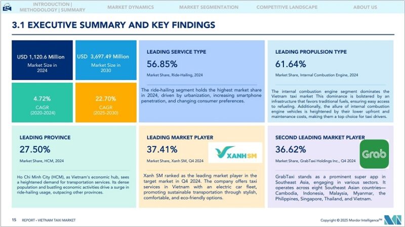 NMAA News – Mengacu data laporan tahunan industri taksi Vietnam oleh Mordor Intelligence, firma riset pasar global terkemuka, Xanh SM berhasil menyodok posisi teratas pasar pasar ride-hailing di Vietnam.