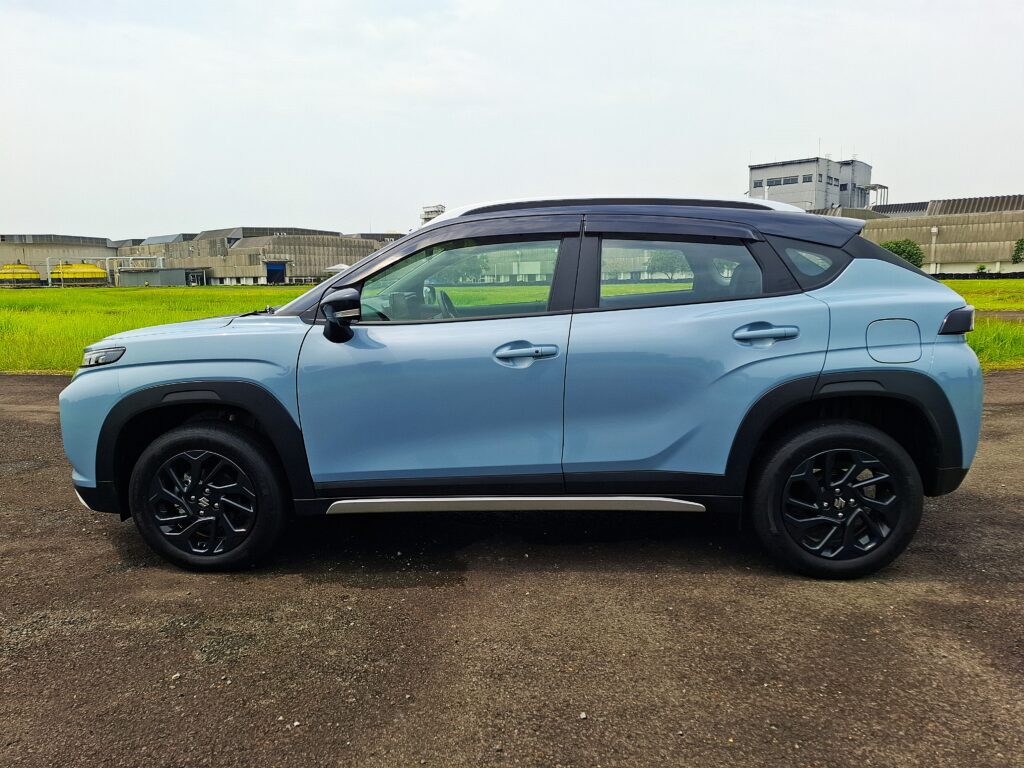 Pada tampilan samping, desain garis bodi tampak memberikan kesan kokoh dan mengalun streamline namun tegas khas SUV. Bentuk bodi yang condong ke belakang dilengkapi sematan over fender berkelir black-doff yang memperkuat unsur maskulinitasnya.