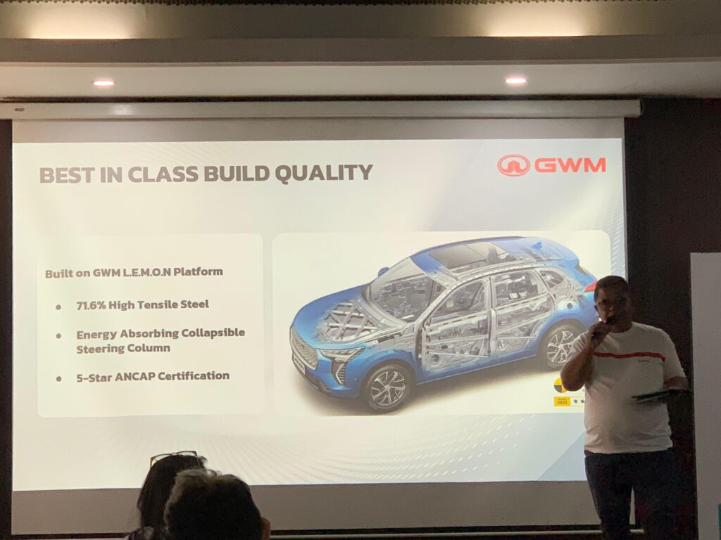 Dalam presentasi product briefing, Putra menjelaskan Haval Jolion Ultra memiliki ‘build quality’ terkait keselamatan yang terbaik di kelasnya. Hal ini berkat penggunaan platform canggih bertajuk GWM L.E.M.O.N.