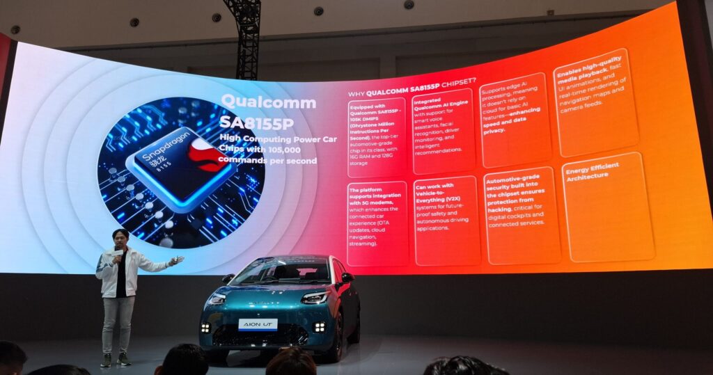 Aion UT hadir dengan prosesor Qualcomm SA8155P, chipset kelas atas yang biasa diadopsi mobil mewah. Chip ini mampu memproses hingga 105.000 perintah per detik, menghasilkan performa cepat, bebas lag, dan stabil saat menjalankan berbagai aplikasi.
